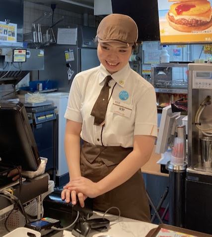 ロッテリア(LOTTERIA)では、キッチン、フロア、カウンターに分かれてそれぞれ役割があります。カウンターではお客様の注文を伺ってキッチンへメニューを伝えます。キッチンはおいしい商品を提供!フロアではお客様が心地よく過ごせるよう清掃したり、席をご案内したり。チームワークで仕事しています!